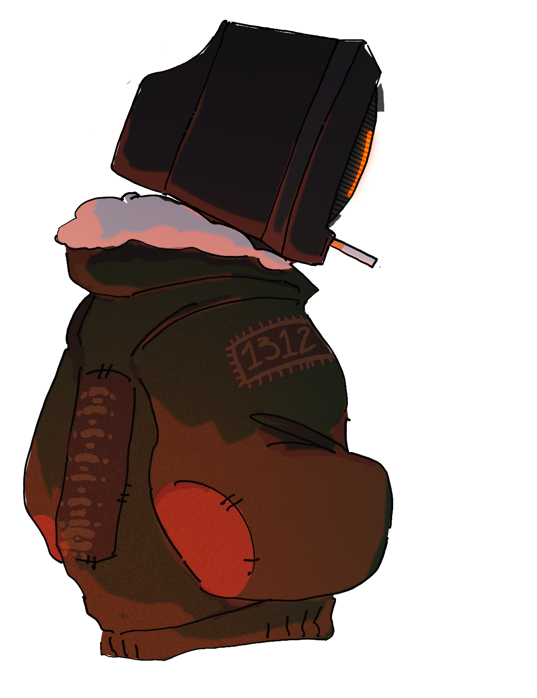 Notable Physical Features: 7’0, android with an old computer monitor for a head, wears a jacket slowly getting more and more covered in patches, [0: